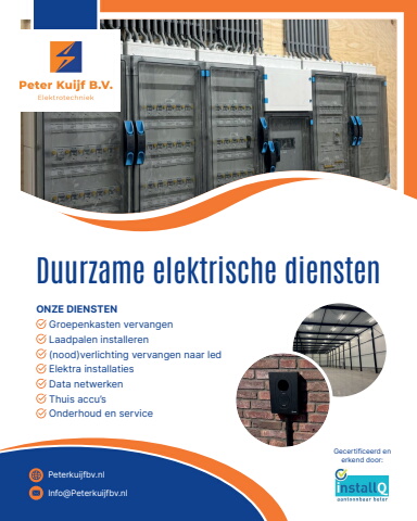 Duurzame elektrische dienstenONZE DIENSTEN Groepenkasten vervangenLaadpalen installeren(nood)verlichting vervangen naar ledElektra installatiesData netwerkenThuis accu%u2019sOnderhoud en servicePeterkuijfbv.nlInfo@Peterkuijfbv.nlGecertificeerd en erkend door: