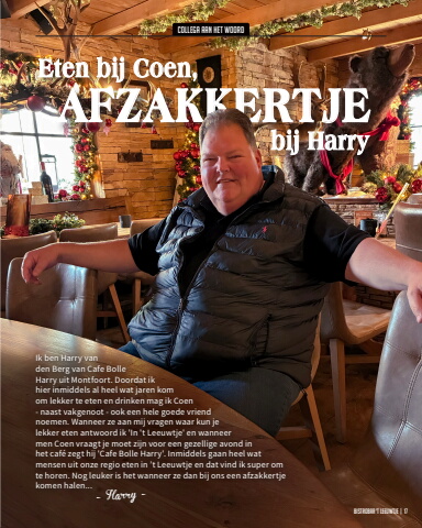 Eten bij Coen,AFZAKKERTJEIk ben Harry van den Berg van Cafe Bolle Harry uit Montfoort. Doordat ik hier inmiddels al heel wat jaren kom om lekker te eten en drinken mag ik Coen - naast vakgenoot - ook een hele goede vriend noemen. Wanneer ze aan mij vragen waar kun je lekker eten antwoord ik 'In 't Leeuwtje' en wanneer men Coen vraagt je moet zijn voor een gezellige avond in het caf%u00e9 zegt hij 'Cafe Bolle Harry'. Inmiddels gaan heel wat mensen uit onze regio eten in %u2019t Leeuwtje en dat vind ik super om te horen. Nog leuker is het wanneer ze dan bij ons een afzakkertje komen halen... - Harry -collega aan het woordbij HarryBistrobar 't leeuwtje | 17