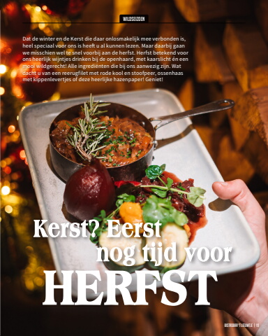 Kerst? Eerstnog tijd voorDat de winter en de Kerst die daar onlosmakelijk mee verbonden is, heel speciaal voor ons is heeft u al kunnen lezen. Maar daarbij gaan we misschien wel te snel voorbij aan de herfst. Herfst betekend voor ons heerlijk wijntjes drinken bij de openhaard, met kaarslicht %u00e9n een mooi wildgerecht! Alle ingredi%u00ebnten die bij ons aanwezig zijn. Wat dacht u van een reerugfilet met rode kool en stoofpeer, ossenhaas met kippenlevertjes of deze heerlijke hazenpaper! Geniet! wildseizoenHERFSTBistrobar 't leeuwtje | 19