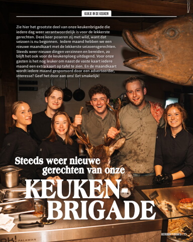 kijkje in de keukenKEUKENBRIGADESteeds weer nieuwe gerechten van onzeZie hier het grootste deel van onze keukenbrigade die iedere dag weer verantwoordelijk is voor de lekkerste gerechten. Deze keer poseren zij met wild, want dat seizoen is nu begonnen. Iedere maand hebben we een nieuwe maandkaart met de lekkerste seizoensgerechten. Steeds weer nieuwe dingen verzinnen en bereiden, zo blijft het ook voor de keukenploeg uitdagend. Voor onze gasten is het nog leuker om naast de vaste kaart iedere maand een extra kaart op tafel te zien. En de maandkaart wordt iedere maand gesponsord door een adverteerder, interesse? Geef het door aan ons! Eet smakelijk!Bistrobar 't leeuwtje | 23