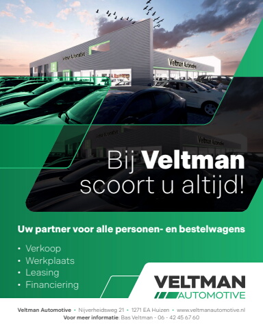 Veltman Automotive %u2022 Nijverheidsweg 21 %u2022 1271 EA Huizen %u2022 www.veltmanautomotive.nl Voor meer informatie: Bas Veltman - 06 - 42 45 67 60Uw partner voor alle personen- en bestelwagens%u2022 Verkoop%u2022 Werkplaats%u2022 Leasing%u2022 FinancieringBij Veltmanscoort u altijd!