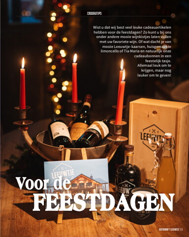 Voor deFEESTDAGENcadeautipsWist u dat wij best veel leuke cadeauartikelen hebben voor de feestdagen? Zo kunt u bij ons onder andere mooie wijnkistjes laten vullen met uw favoriete wijn. Of wat dacht je van mooie Leeuwtje-kaarsen, huisgemaakte limoncello of Tia Maria en natuurlijk onze cadeaubonnen in een feestelijk tasje. Allemaal leuk om te krijgen, maar nog leuker om te geven!Bistrobar 't leeuwtje | 5