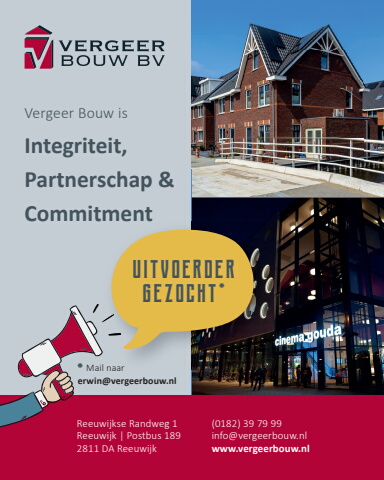 Vergeer Bouw isIntegriteit, Partnerschap & CommitmentReeuwijkse Randweg 1Reeuwijk | Postbus 1892811 DA Reeuwijk(0182) 39 79 99info@vergeerbouw.nlwww.vergeerbouw.nlUITVOERDER GEZOCHT**Mail naarerwin@vergeerbouw.nl